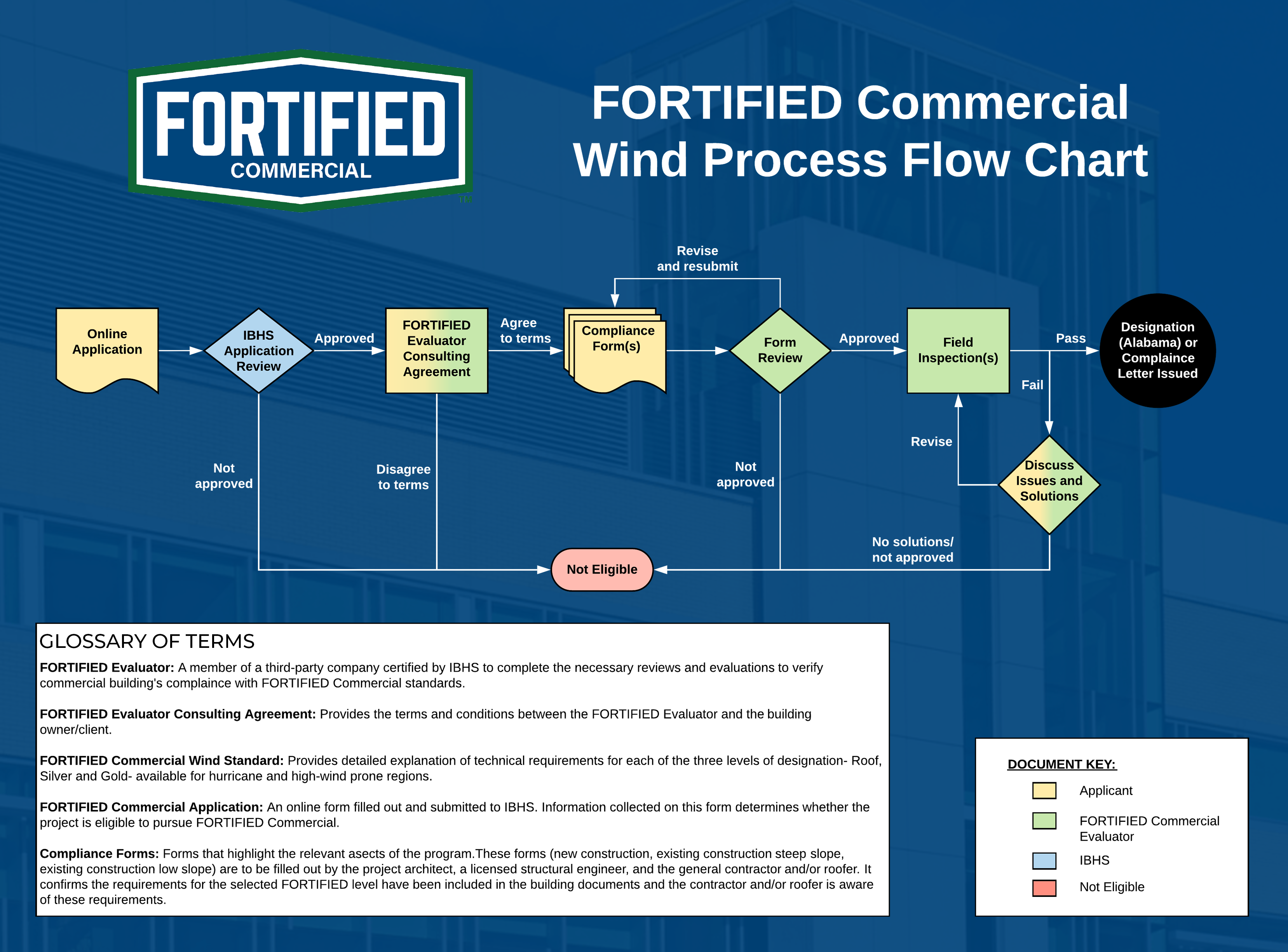 Once you negotiate a consulting agreement with the Evaluator, they will complete the necessary reviews and evaluations to verify the construction project complies with the FORTIFIED standard.
