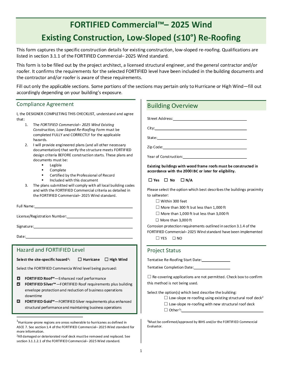 This form is to be filled out by the project architect, a licensed structural engineer, and the general contractor and/or roofer. It confirms the requirements for the selected FORTIFIED level have been included in the building documents and the contractor and/or roofer is aware of these requirements.