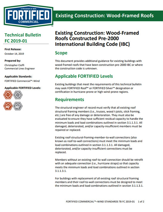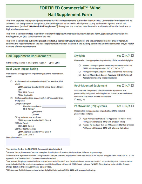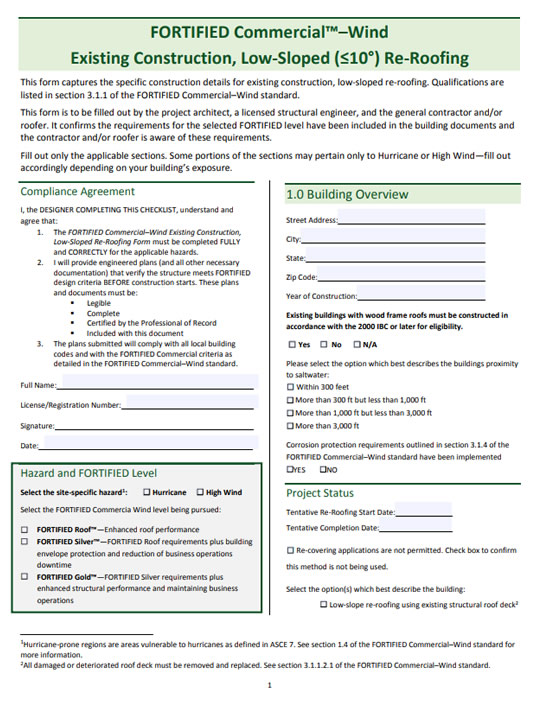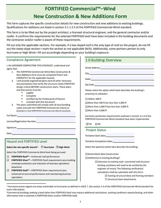 This form captures the specific construction details for new construction and new additions to existing buildings. Qualifications are listed in section 3.1.1.2.3 of the FORTIFIED Commercial standard.