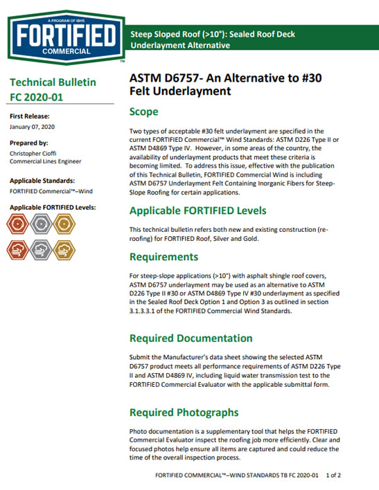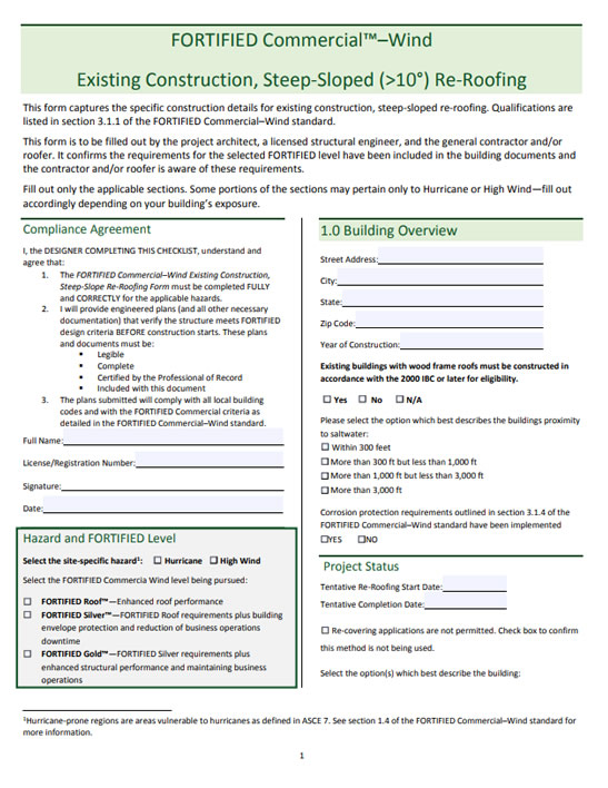 These forms are to be filled out by the project architect, a licensed structural engineer, and the general contractor and/or roofer. It confirms the requirements for the selected FORTIFIED level have been included in the building documents and the contractor and/or roofer is aware of these requirements.